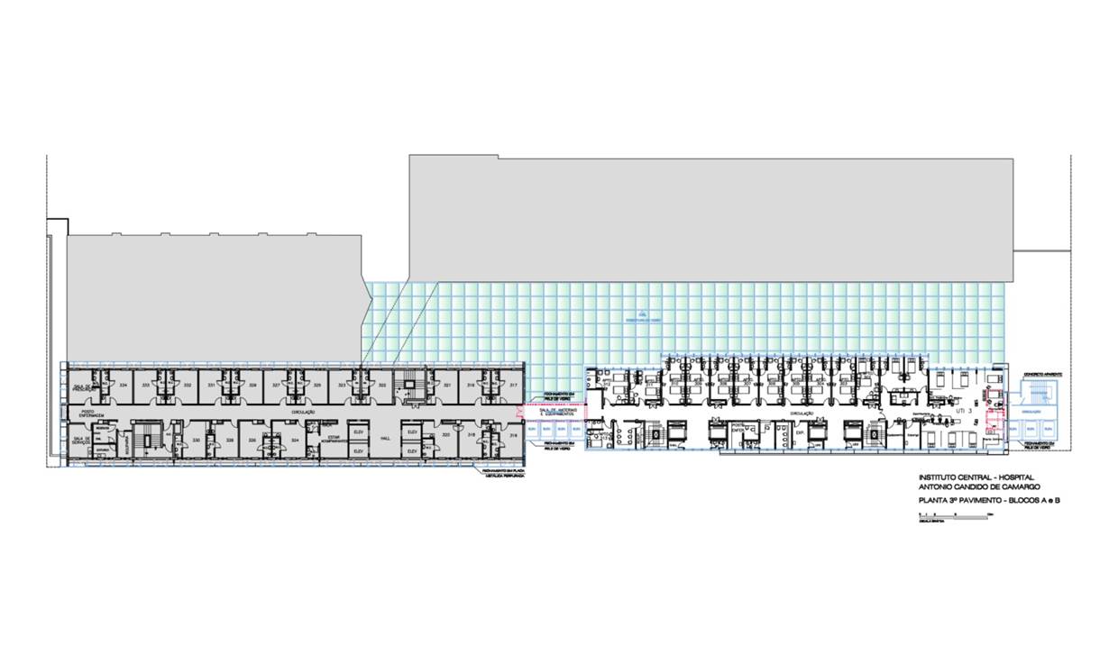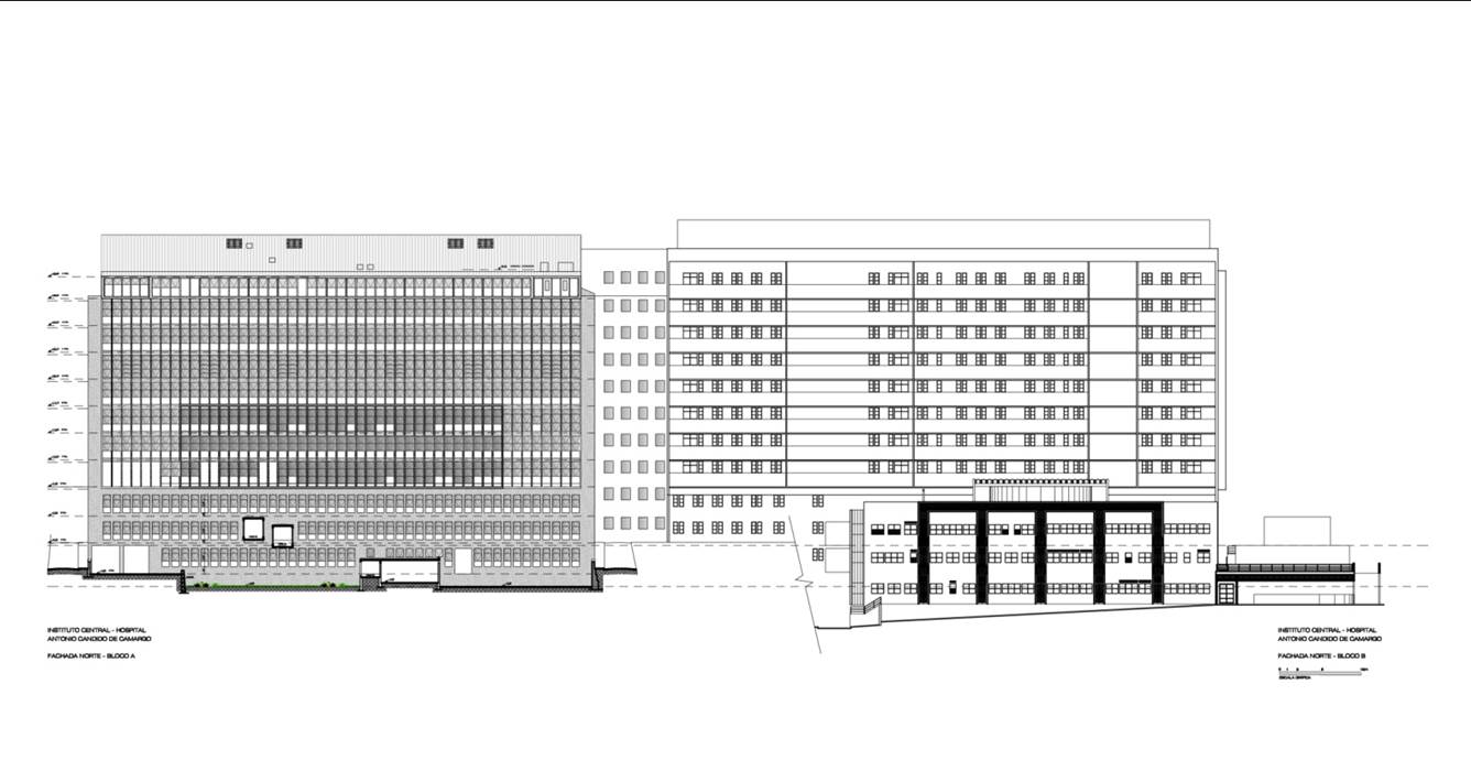 Tal linguagem contemporânea será mantida na ligação entre dois blocos, no átrio e na nova caixa de elevadores localizada na fachada lateral leste do Bloco A, esta executada em concreto aparente e vidro. As fachadas norte e sul do bloco C Serão recompostas, com o rebaixamento das antigas aberturas das fachadas, resgatando sua aparência original.