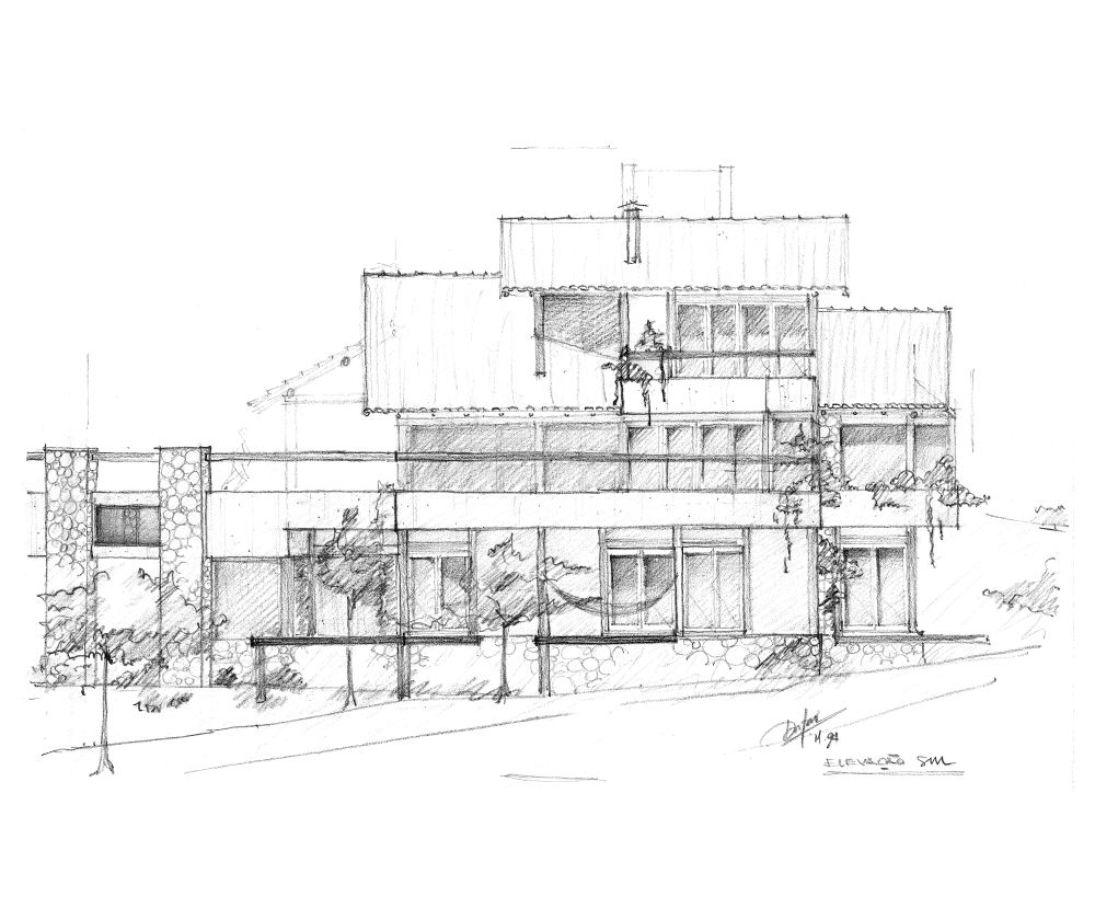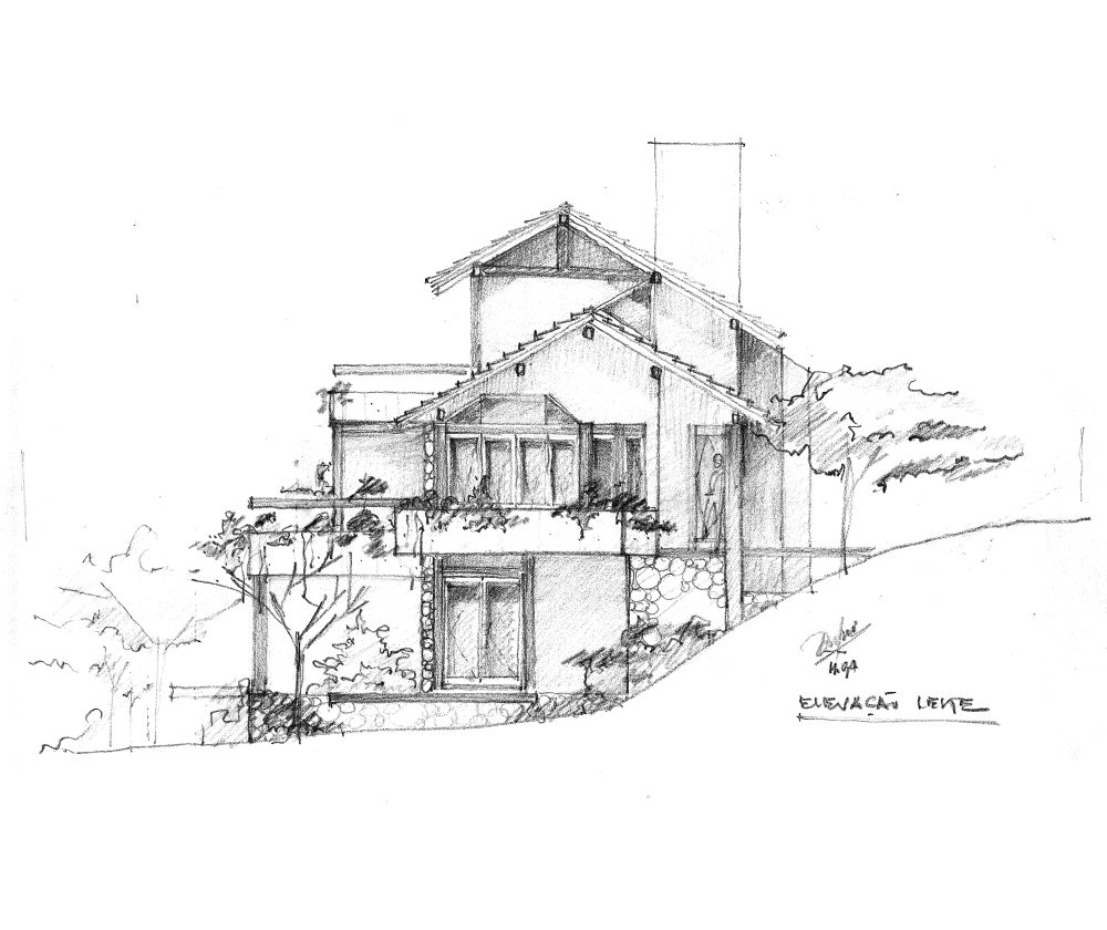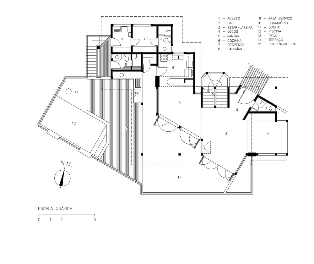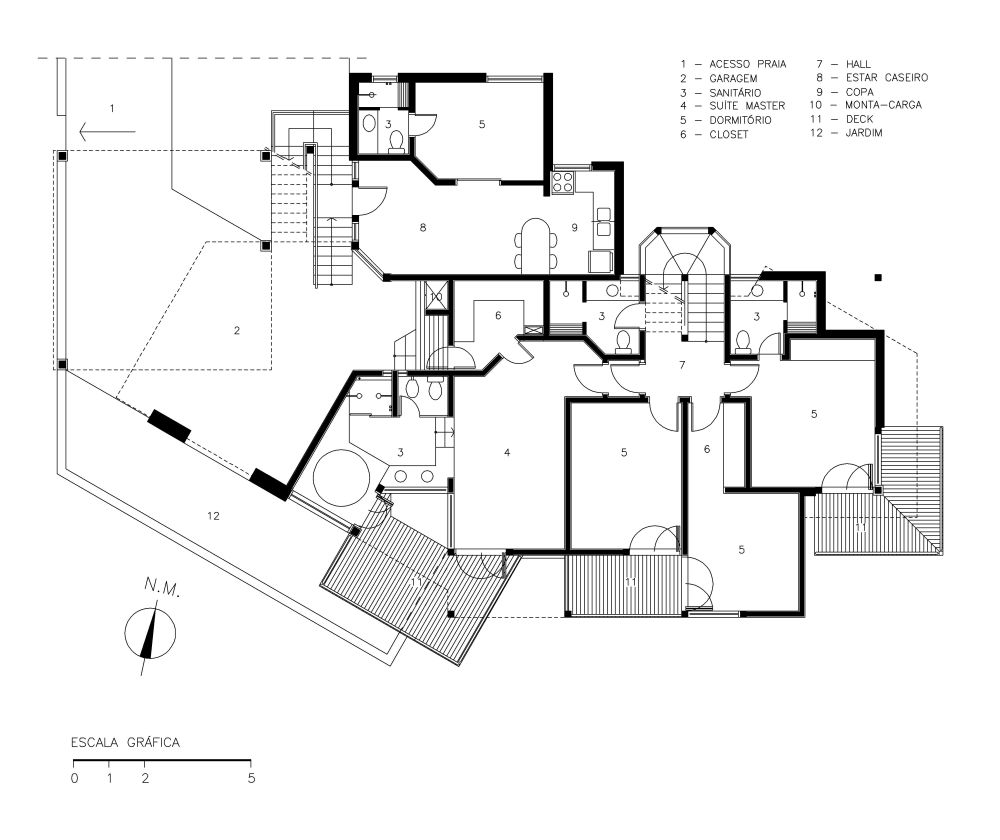O declive acentuado do terreno permite a utilização de plataformas no desenho para absoluta privacidade do nível rebaixado dos dormitórios e dispõe para a suíte master, com vista para a praia, uma integração íntima com o ambiente.